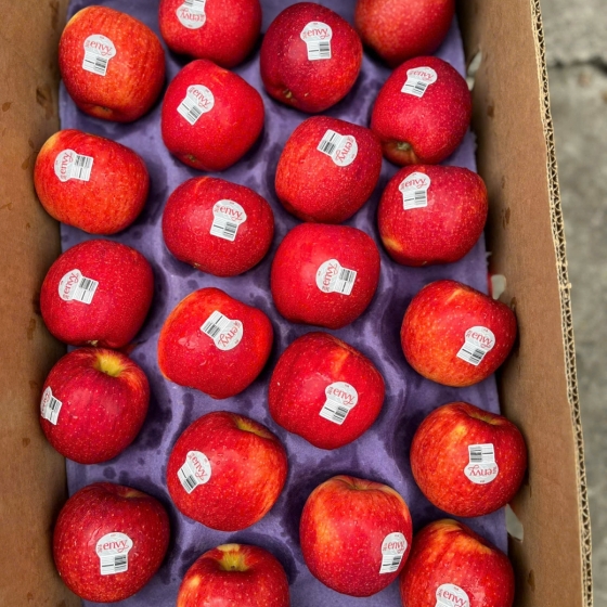 Sản phẩm được đóng gói nguyên thùng Net 18KG full size, đảm bảo số lượng lớn và đa dạng kích cỡ để phục vụ nhiều mục đích khác nhau. Bên trong, táo được sắp xếp ngay ngắn trên lớp lót màu tím, bảo quản tối ưu cho quá trình vận chuyển.
