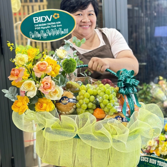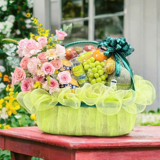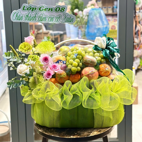 Giỏ trái cây được thiết kế theo phong cách hiện đại, hoành tráng, nổi bật khi kết hợp hoa tươi 2 bên giỏ, và trái cây cao cấp. giỏ gồm trái cây: Lê nâu Hàn, Quýt Úc, kiwi vàng, Lựu Thái, nho mẫu đơn Hàn, cam vàng Úc, cam dolci Úc, táo đỏ envy, dưa lưới...