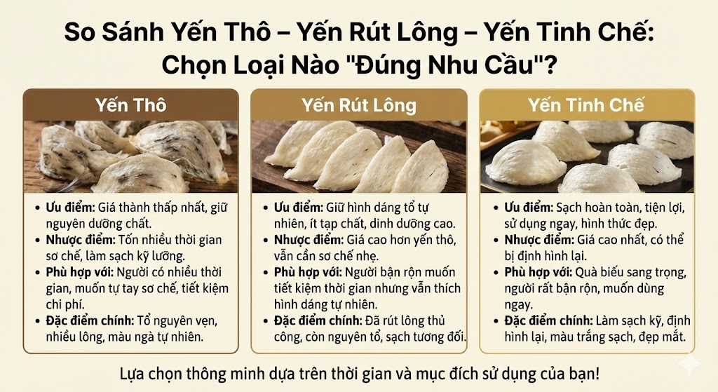 So sánh yến thô – yến rút lông – yến tinh chế: chọn loại nào “đúng nhu cầu”?