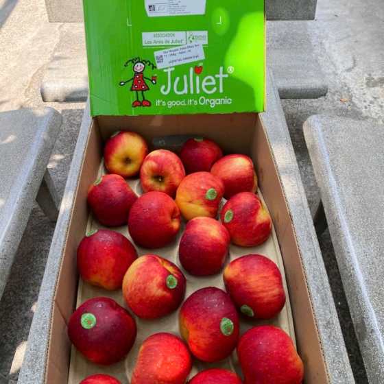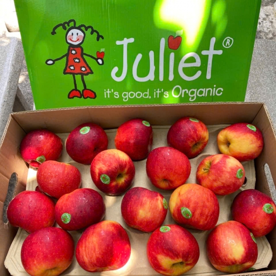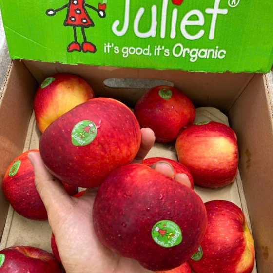 Chứng nhận Organic: Mỗi quả táo Juliet đều mang logo "Bio" đặc trưng, đảm bảo quy trình trồng trọt tự nhiên nhất.